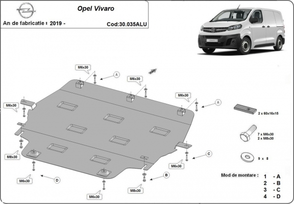 Skid plate for the protection of the: engine, gearbox, radiator . The skid plate is new and fits perfectly for all versions of Opel Vivaro manufactured between 2019 and 2026. Made out of 3 mm thick Aluminium plate. The shields are made of aluminum, but the mounting brackets are made of steel. Screws, nuts, clips, all fastening accessories are included. All skid plates are powder coated to prevent corrosion. The exterior of the skid plate is provided with Aluminium reinforcements, which increases the resistance to impact. |