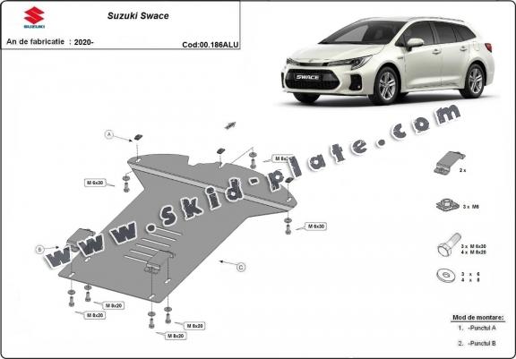 Skid plate for the protection of the: Catalytic converter . The skid plate is new and fits perfectly for all versions of Suzuki Swace manufactured between 2020 and 2025. Made out of 3 mm thick Aluminium plate. The shields are made of aluminum, but the mounting brackets are made of steel. Screws, nuts, clips, all fastening accessories are included. All skid plates are powder coated to prevent corrosion. The exterior of the skid plate is provided with Aluminium reinforcements, which increases the resistance to impact. |