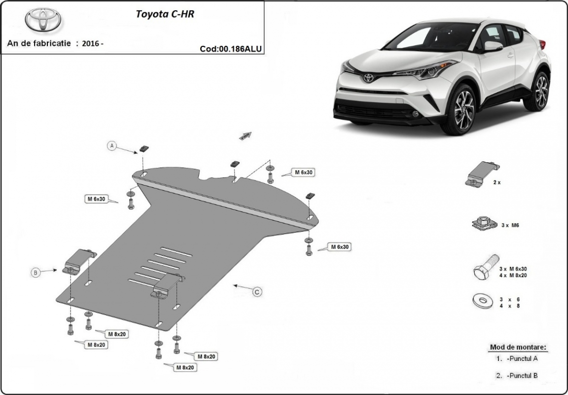 Skid plate for the protection of the: Catalytic converter . The skid plate is new and fits perfectly for all versions of Toyota C-HR manufactured between 2016 and 2023. Made out of 3 mm thick Aluminium plate. The shields are made of aluminum, but the mounting brackets are made of steel. Screws, nuts, clips, all fastening accessories are included. All skid plates are powder coated to prevent corrosion. The exterior of the skid plate is provided with Aluminium reinforcements, which increases the resistance to impact. |