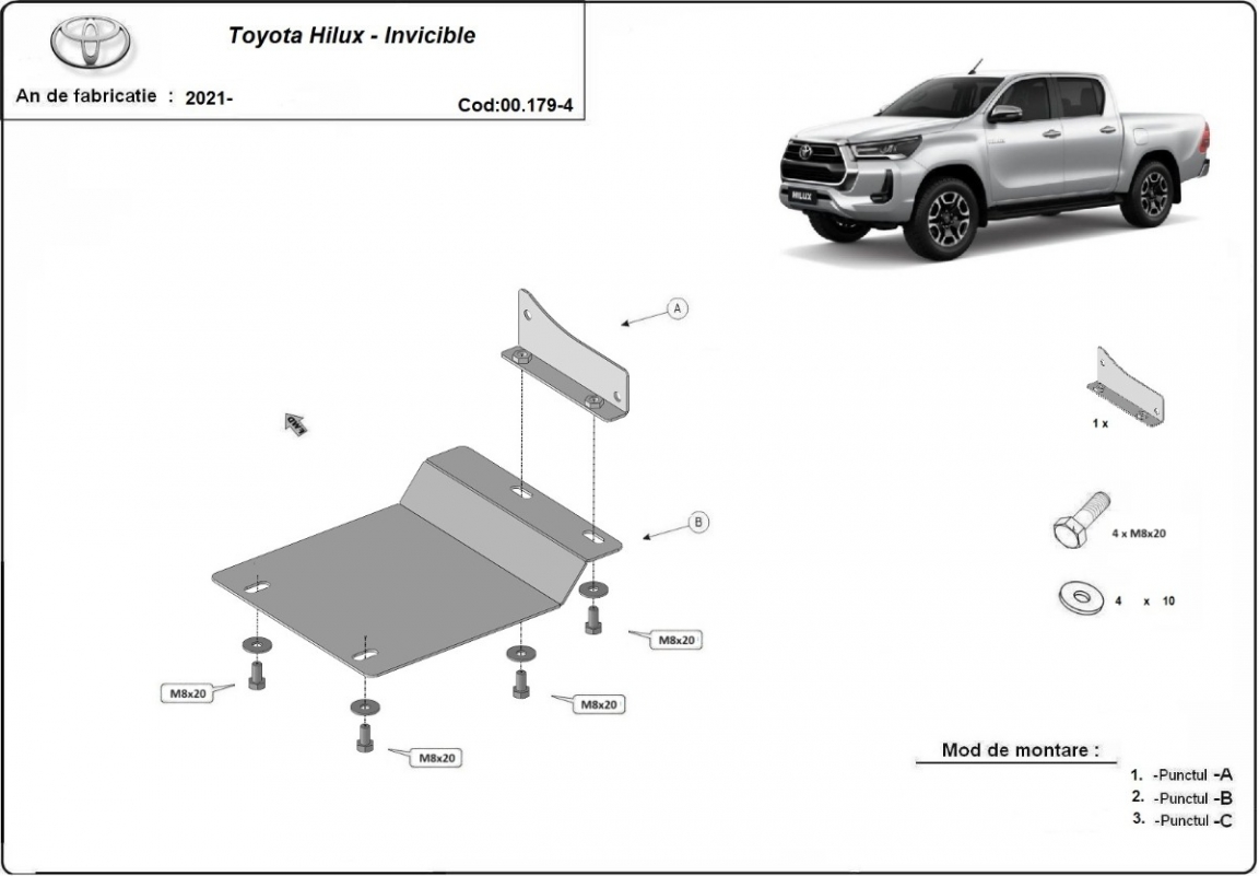 Skid plate for the protection of the: particle filter sensor . The skid plate is new and fits perfectly for all versions of Toyota Hilux manufactured between 2021 and 2026. Made out of 4 mm thick Aluminium plate. The shields are made of aluminum, but the mounting brackets are made of steel. Screws, nuts, clips, all fastening accessories are included. All skid plates are powder coated to prevent corrosion. The exterior of the skid plate is provided with Aluminium reinforcements, which increases the resistance to impact. |