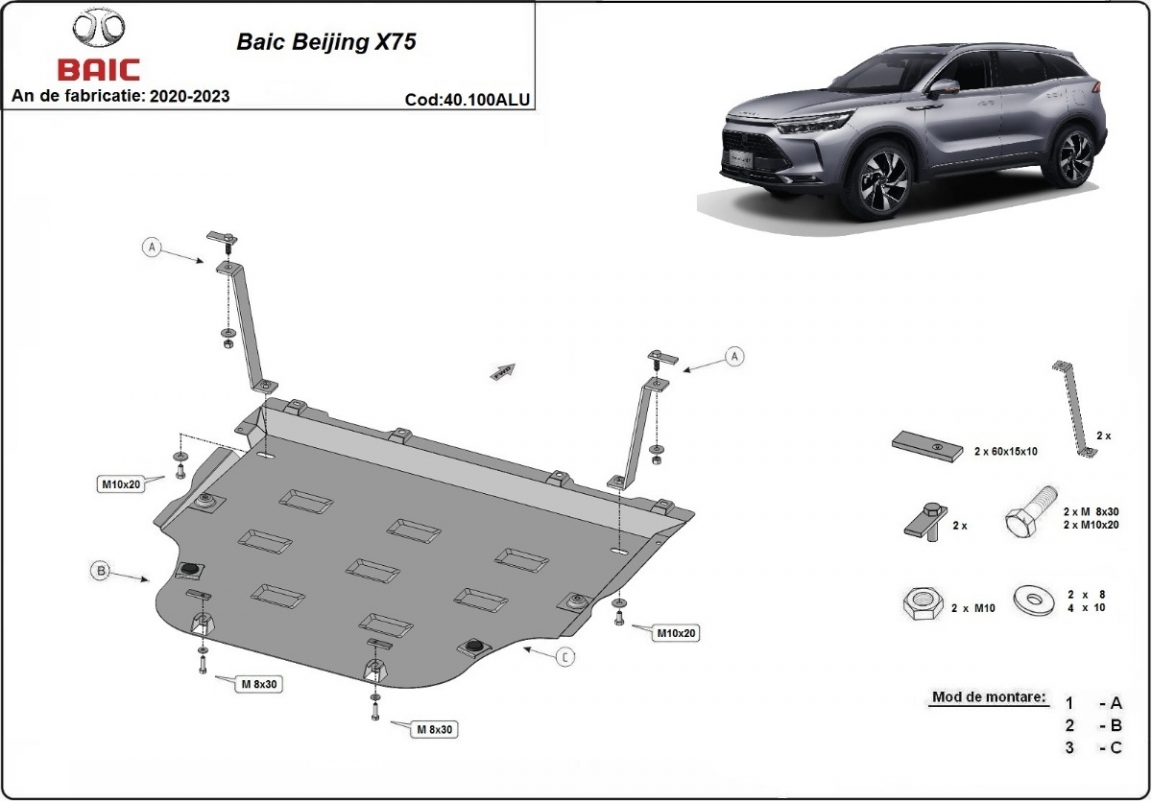 Skid plate for the protection of the: engine, gearbox, radiator . The skid plate is new and fits perfectly for all versions of BAIC Beijing X75 manufactured between 2020 and 2023. Made out of 3 mm thick Aluminium plate. The shields are made of aluminum, but the mounting brackets are made of steel. Screws, nuts, clips, all fastening accessories are included. All skid plates are powder coated to prevent corrosion. The exterior of the skid plate is provided with Aluminium reinforcements, which increases the resistance to impact. |