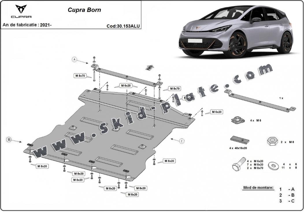Skid plate for the protection of the: engine, gearbox, radiator . The skid plate is new and fits perfectly for all versions of Cupra Born manufactured between 2021 and 2025. Made out of 3 mm thick Aluminium plate. The shields are made of aluminum, but the mounting brackets are made of steel. Screws, nuts, clips, all fastening accessories are included. All skid plates are powder coated to prevent corrosion. The exterior of the skid plate is provided with Aluminium reinforcements, which increases the resistance to impact. |