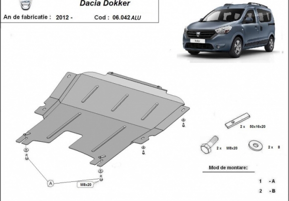 Skid plate for the protection of the: engine, gearbox . The skid plate is new and fits perfectly for all versions of Dacia Dokker manufactured between 2012 and 2026. Made out of 4 mm thick Aluminium plate. The shields are made of aluminum, but the mounting brackets are made of steel. Screws, nuts, clips, all fastening accessories are included. All skid plates are powder coated to prevent corrosion. The exterior of the skid plate is provided with Aluminium reinforcements, which increases the resistance to impact. |