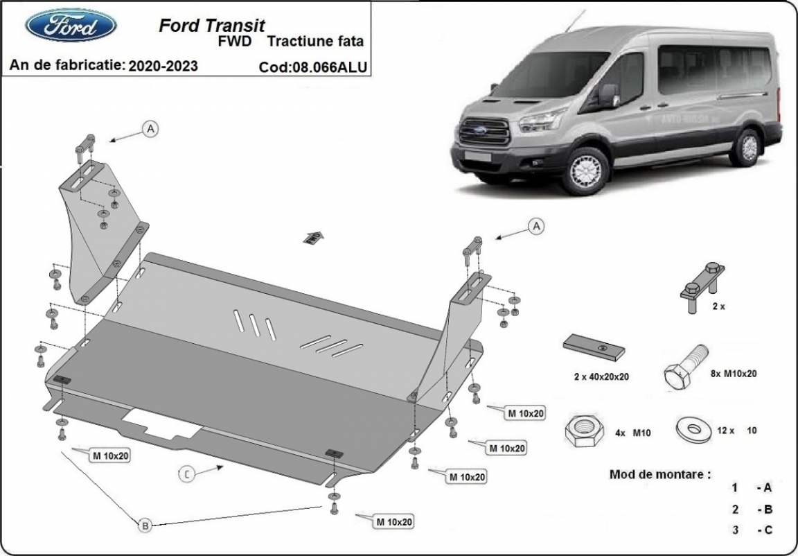 Skid plate for the protection of the: engine, gearbox, radiator, front bumper . The skid plate is new and fits perfectly for all versions of Ford Transit manufactured between 2020 and 2026. Made out of 3 mm thick Aluminium plate. The shields are made of aluminum, but the mounting brackets are made of steel. Screws, nuts, clips, all fastening accessories are included. All skid plates are powder coated to prevent corrosion. The exterior of the skid plate is provided with Aluminium reinforcements, which increases the resistance to impact. |