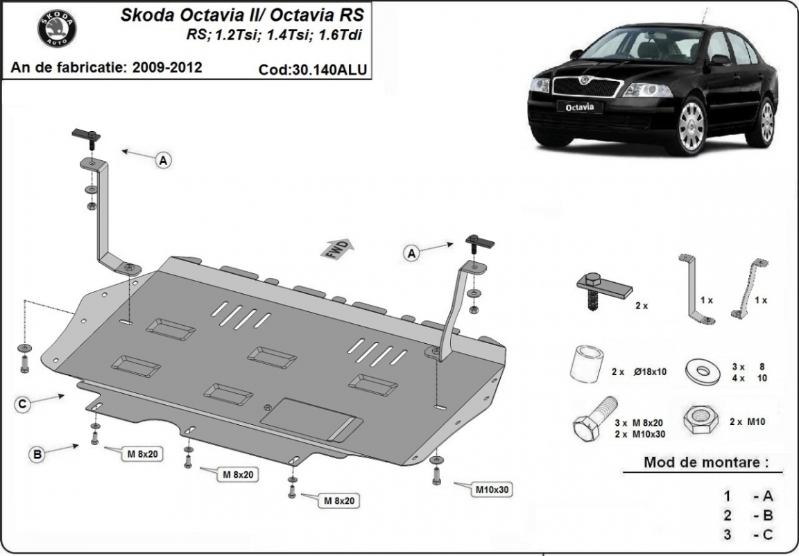 Aluminum skid plate for Skoda Octavia 2 (2009-2012)