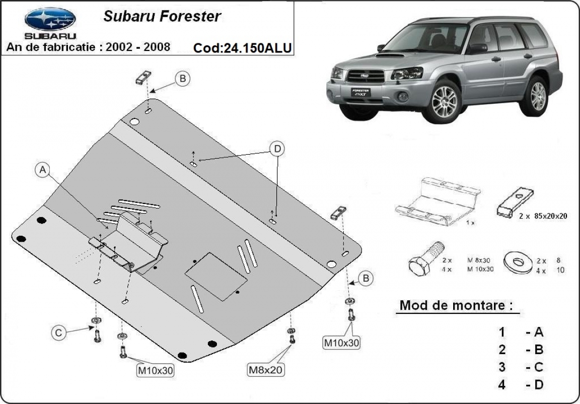 Skid plate for the protection of the: engine . The skid plate is new and fits perfectly for all versions of Subaru Forester 2 manufactured between 2002 and 2008. Made out of 3 mm thick Aluminium plate. The shields are made of aluminum, but the mounting brackets are made of steel. Screws, nuts, clips, all fastening accessories are included. All skid plates are powder coated to prevent corrosion. The exterior of the skid plate is provided with Aluminium reinforcements, which increases the resistance to impact. |