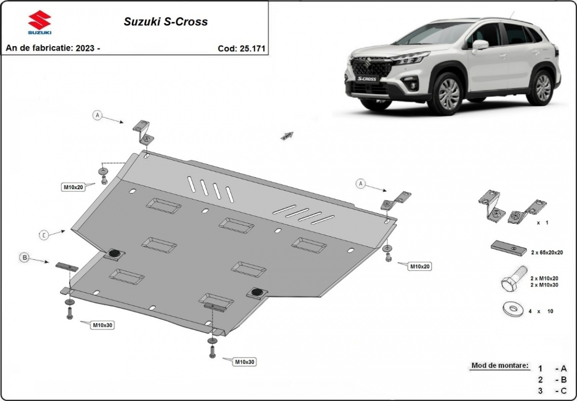 Skid plate for the protection of the: engine, gearbox . The skid plate is new and fits perfectly for all versions of Suzuki S-Cross manufactured between 2023 and 2026. Made out of 4 mm thick Aluminium plate. The shields are made of aluminum, but the mounting brackets are made of steel. Screws, nuts, clips, all fastening accessories are included. All skid plates are powder coated to prevent corrosion. The exterior of the skid plate is provided with Aluminium reinforcements, which increases the resistance to impact. |