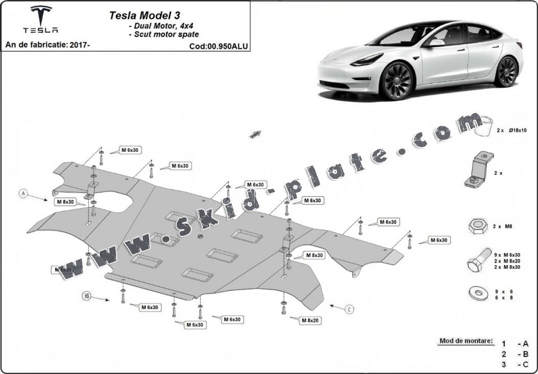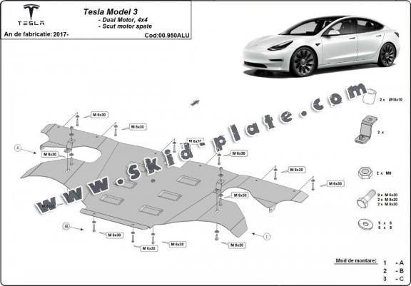 Skid plate for the protection of the: rear electric motor . The skid plate is new and fits perfectly for all versions of Tesla Model 3 AWD manufactured between 2017 and 2026. Made out of 3 mm thick Aluminium plate. The shields are made of aluminum, but the mounting brackets are made of steel. Screws, nuts, clips, all fastening accessories are included. All skid plates are powder coated to prevent corrosion. The exterior of the skid plate is provided with Aluminium reinforcements, which increases the resistance to impact. |