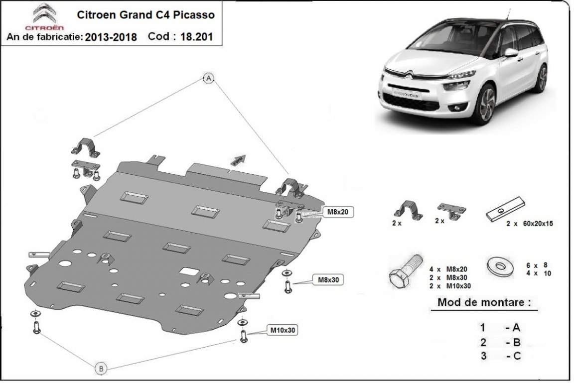 Skid plate for the protection of the: engine, gearbox, radiator, front bumper, subframe . The skid plate is new and fits perfectly for all versions of Citroen Grand C4 Picasso manufactured between 2013 and 2018. Made out of 2 mm thick Steel plate. Screws, nuts, clips, all fastening accessories are included. All skid plates are powder coated to prevent corrosion. The exterior of the skid plate is provided with Steel reinforcements, which increases the resistance to impact. |