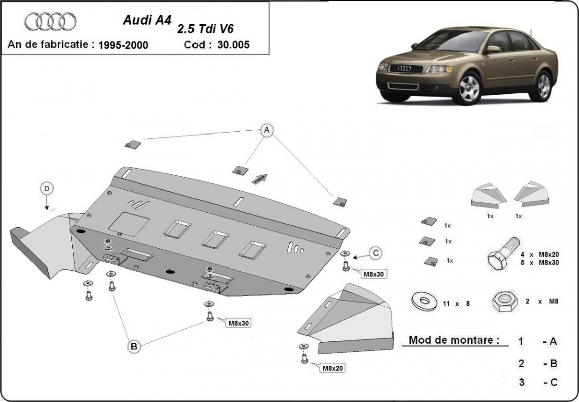 Skid plate for the protection of the: engine, radiator, front bumper . The skid plate is new and fits perfectly for the Audi A4 B5, with the following engine/drive versions: petrol V6, 2.6, 2.8, diesel - 2.5 D - manufactured between 1997 and 2000. It has an opening for the oil sump, so it's removal won't be necessary to change the oil. Made out of 2 mm thick Steel plate. Screws, nuts, clips, all fastening accessories are included. All skid plates are powder coated to prevent corrosion. The exterior of the skid plate is provided with Steel reinforcements, which increases the resistance to impact. |