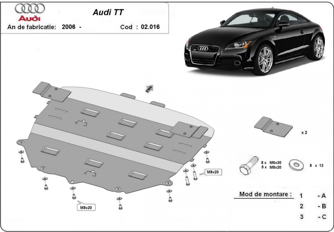 Skid plate for the protection of the: engine, gearbox, radiator, front bumper . The skid plate is new and fits perfectly for all versions of Audi TT manufactured between 2006 and 2014. Made out of 2 mm thick Steel plate. Screws, nuts, clips, all fastening accessories are included. All skid plates are powder coated to prevent corrosion. The exterior of the skid plate is provided with Steel reinforcements, which increases the resistance to impact. |