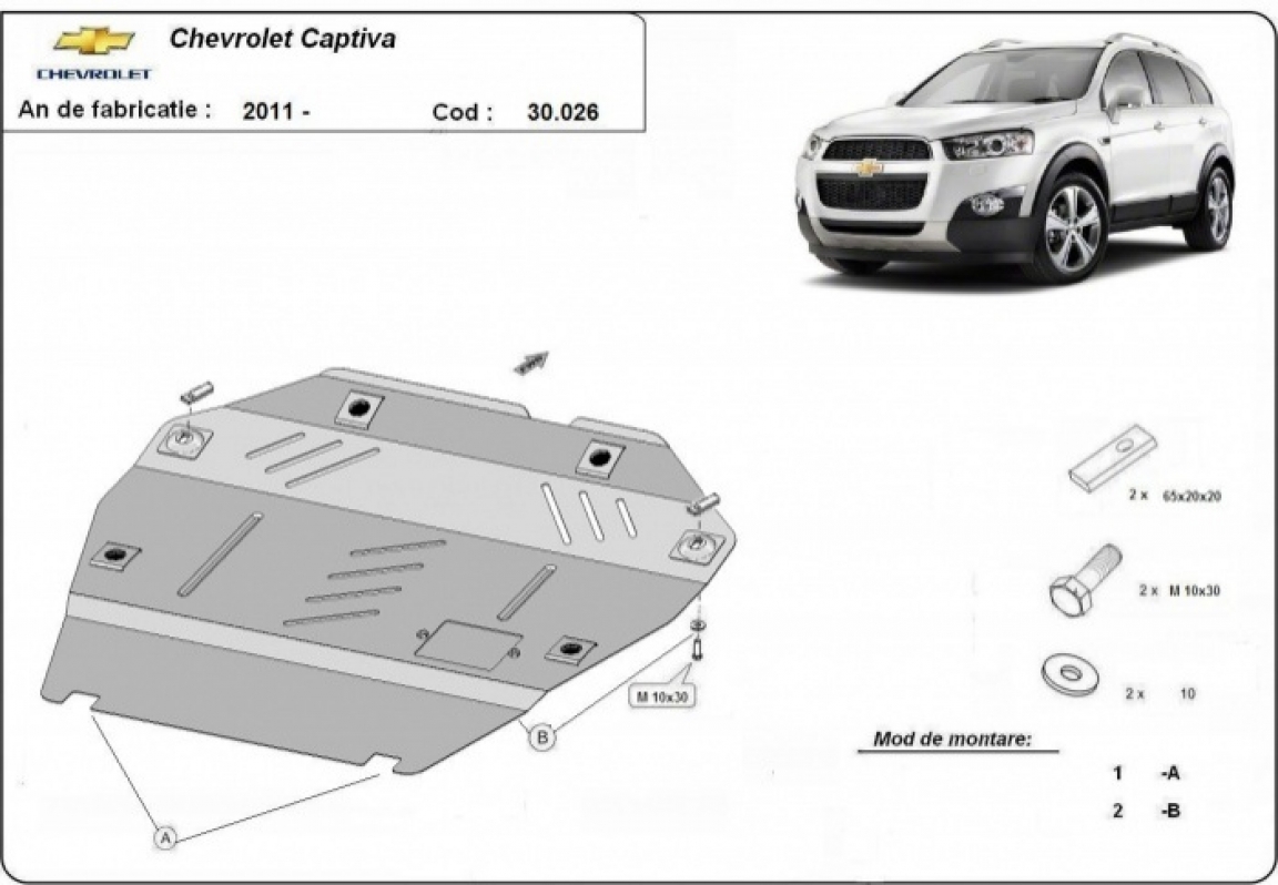 Skid plate for the protection of the: engine, gearbox . The skid plate is new and fits perfectly for all versions of Chevrolet Captiva manufactured between 2010 and 2018. It has an opening for the oil sump, so it's removal won't be necessary to change the oil. Made out of 2 mm thick Steel plate. Screws, nuts, clips, all fastening accessories are included. All skid plates are powder coated to prevent corrosion. The exterior of the skid plate is provided with Steel reinforcements, which increases the resistance to impact. |