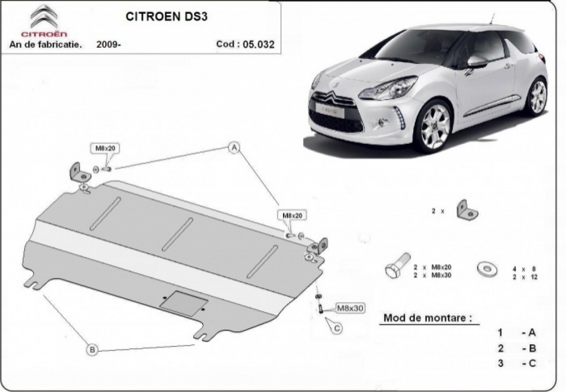 Skid plate for the protection of the: engine, gearbox . The skid plate is new and fits perfectly for the Citroen DS3, with the following engine/drive versions: 1.1,1.2, 1.4, 1.6, 1.6 HDI - manufactured between 2009 and 2026. It has an opening for the oil sump, so it's removal won't be necessary to change the oil. Made out of 2 mm thick Steel plate. Screws, nuts, clips, all fastening accessories are included. All skid plates are powder coated to prevent corrosion. The exterior of the skid plate is provided with Steel reinforcements, which increases the resistance to impact. |