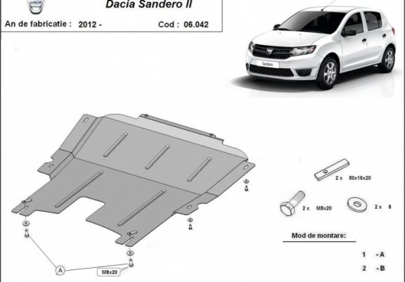 Skid plate for the protection of the: engine, gearbox . The skid plate is new and fits perfectly for all versions of Dacia Sandero 2 manufactured between 2012 and 2020. Made out of 2 mm thick Steel plate. Screws, nuts, clips, all fastening accessories are included. All skid plates are powder coated to prevent corrosion. The exterior of the skid plate is provided with Steel reinforcements, which increases the resistance to impact. |