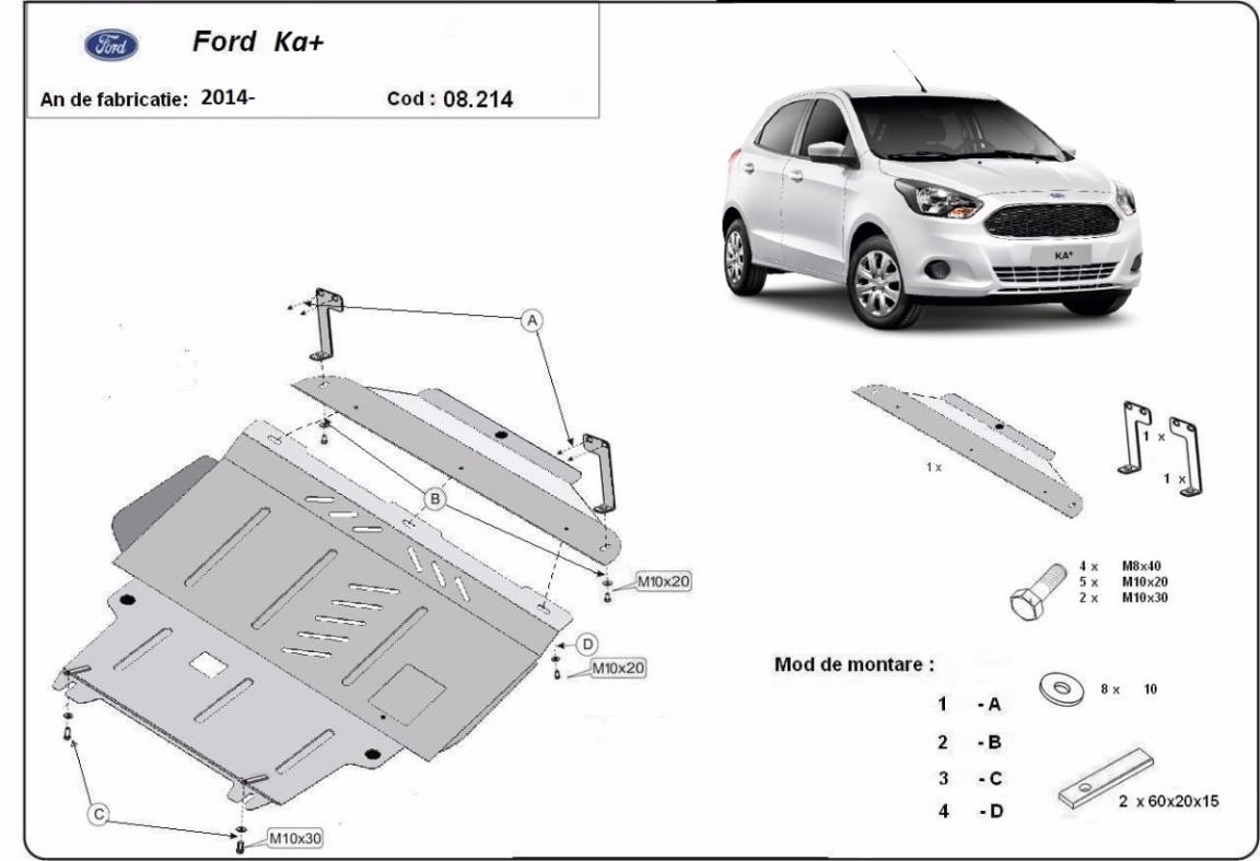 Skid plate for the protection of the: engine, gearbox, radiator, front bumper . The skid plate is new and fits perfectly for all versions of Ford KA manufactured between 2014 and 2020. It has an opening for the oil sump, so it's removal won't be necessary to change the oil. Made out of 2 mm thick Steel plate. Screws, nuts, clips, all fastening accessories are included. All skid plates are powder coated to prevent corrosion. The exterior of the skid plate is provided with Steel reinforcements, which increases the resistance to impact. |
