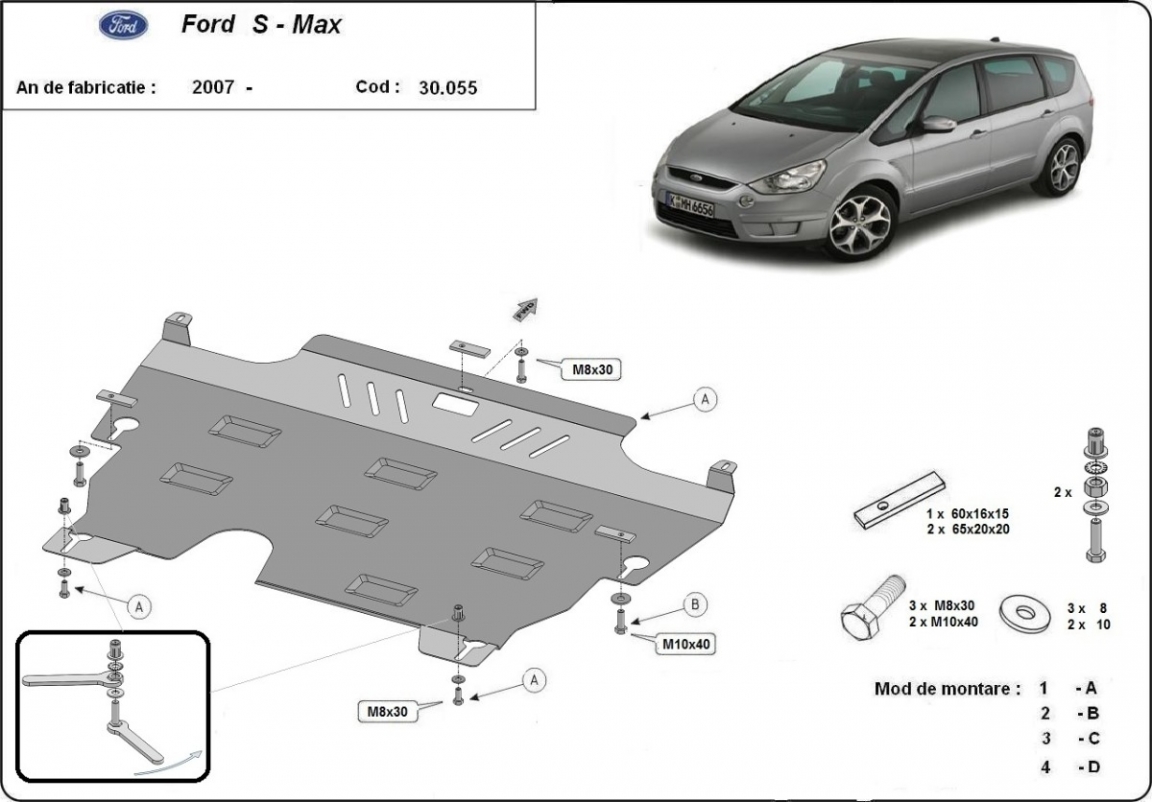 Skid plate for the protection of the: engine, gearbox, radiator . The skid plate is new and fits perfectly for all versions of Ford S-Max manufactured between 2006 and 2015. Made out of 2 mm thick Steel plate. Screws, nuts, clips, all fastening accessories are included. All skid plates are powder coated to prevent corrosion. The exterior of the skid plate is provided with Steel reinforcements, which increases the resistance to impact. |