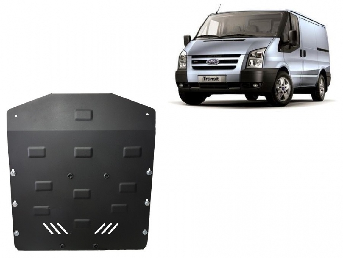 Skid plate for the protection of the: engine, gearbox, radiator, front bumper . The skid plate is new and fits perfectly for all versions of Ford Transit - RWD manufactured between 2007 and 2013. Made out of 2 mm thick Steel plate. Screws, nuts, clips, all fastening accessories are included. All skid plates are powder coated to prevent corrosion. The exterior of the skid plate is provided with Steel reinforcements, which increases the resistance to impact. |