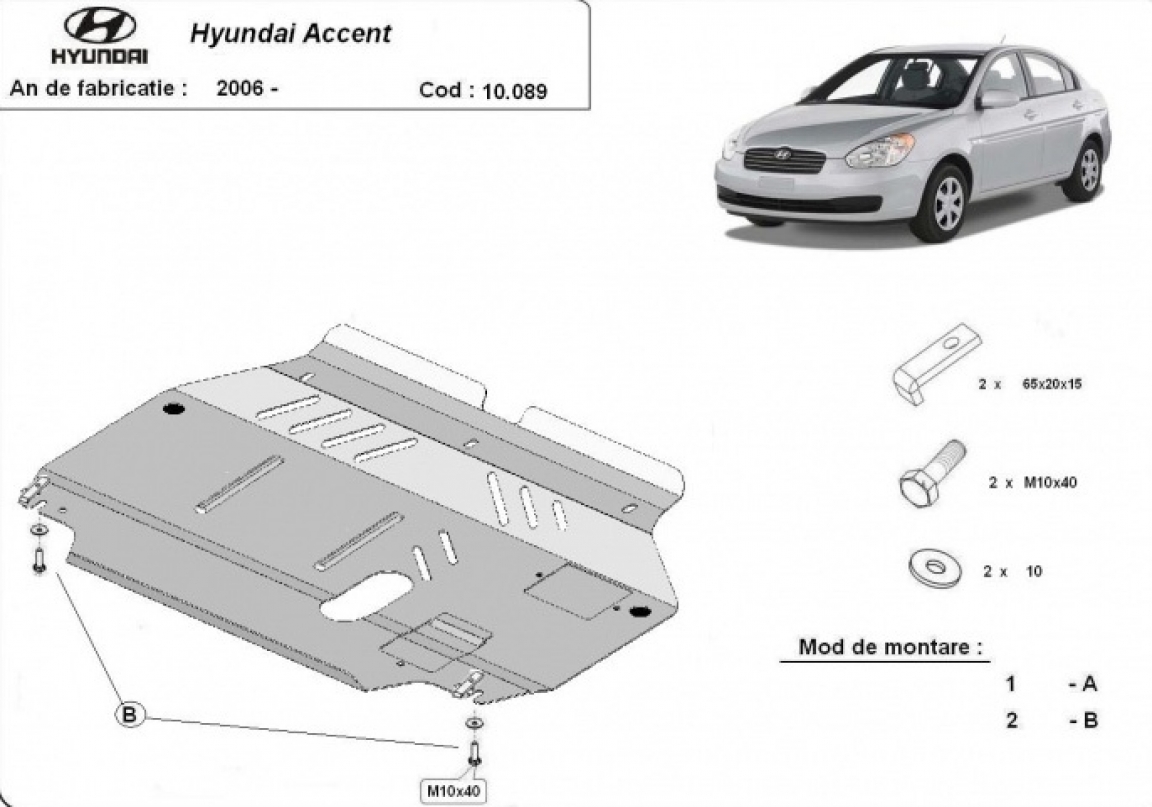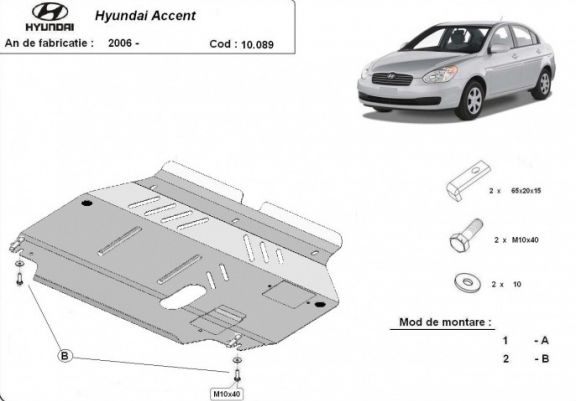 Skid plate for the protection of the: engine, gearbox, radiator . The skid plate is new and fits perfectly for all versions of Hyundai Accent manufactured between 2005 and 2010. It has an opening for the oil sump, so it's removal won't be necessary to change the oil. Made out of 2 mm thick Steel plate. Screws, nuts, clips, all fastening accessories are included. All skid plates are powder coated to prevent corrosion. The exterior of the skid plate is provided with Steel reinforcements, which increases the resistance to impact. |