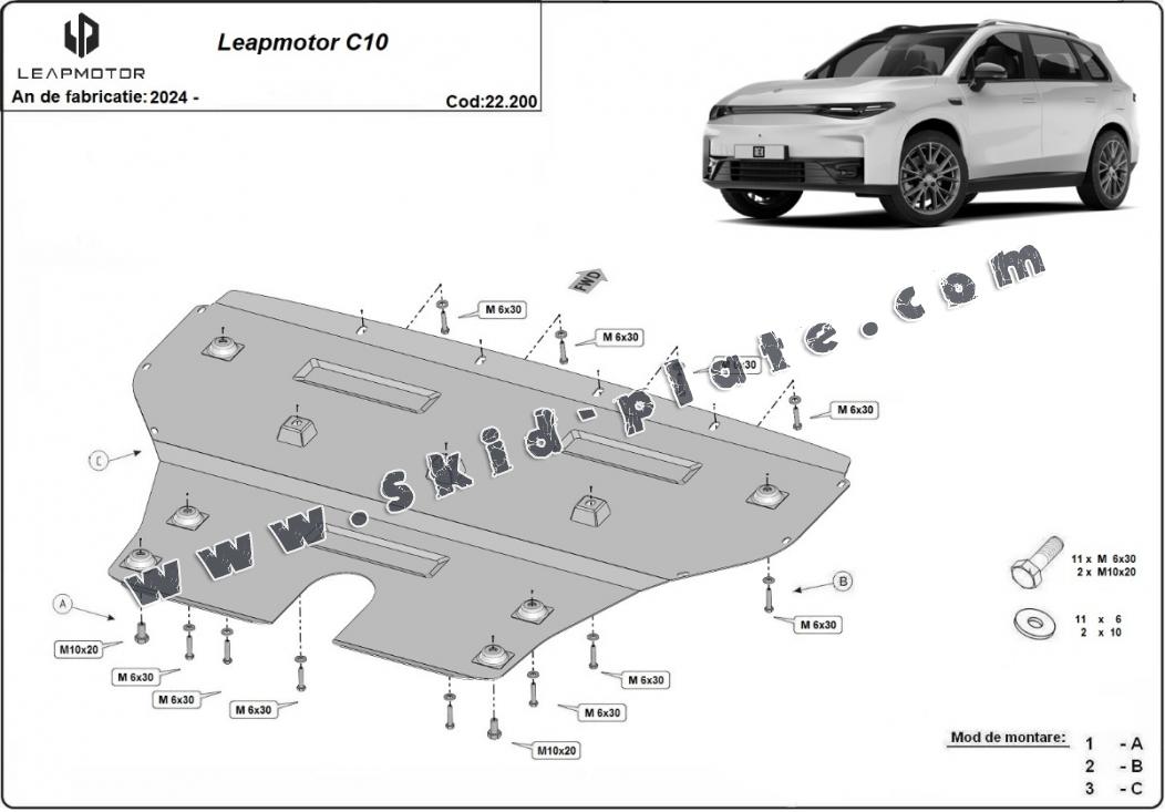 Skid plate for the protection of the: engine, gearbox . The skid plate is new and fits perfectly for all versions of Leapmotor C10 manufactured between 2024 and 2026. Made out of 2 mm thick Steel plate. Screws, nuts, clips, all fastening accessories are included. All skid plates are powder coated to prevent corrosion. The exterior of the skid plate is provided with Steel reinforcements, which increases the resistance to impact. |