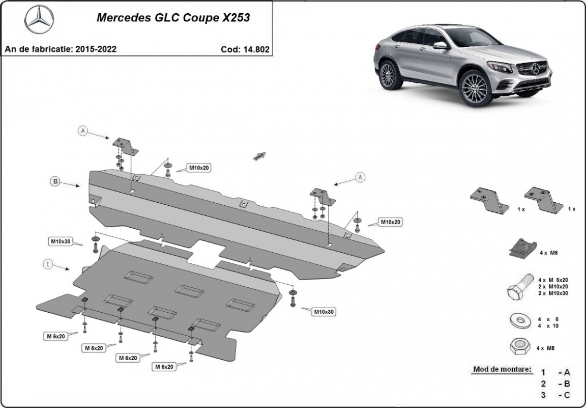 Skid plate for the protection of the: engine, radiator, front bumper . The skid plate is new and fits perfectly for all versions of Mercedes GLC Coupe X253 manufactured between 2015 and 2022. Made out of 2.5 mm thick Steel plate. Screws, nuts, clips, all fastening accessories are included. All skid plates are powder coated to prevent corrosion. The exterior of the skid plate is provided with Steel reinforcements, which increases the resistance to impact. |