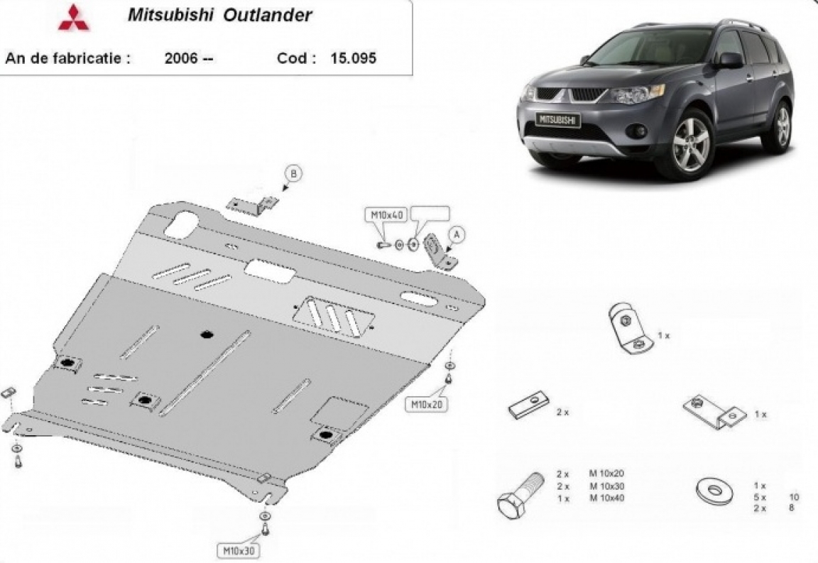 Skid plate for the protection of the: engine, gearbox, radiator . The skid plate is new and fits perfectly for all versions of Mitsubishi Outlander manufactured between 2006 and 2012. It has an opening for the oil sump, so it's removal won't be necessary to change the oil. Made out of 2.5 mm thick Steel plate. Screws, nuts, clips, all fastening accessories are included. All skid plates are powder coated to prevent corrosion. The exterior of the skid plate is provided with Steel reinforcements, which increases the resistance to impact. |