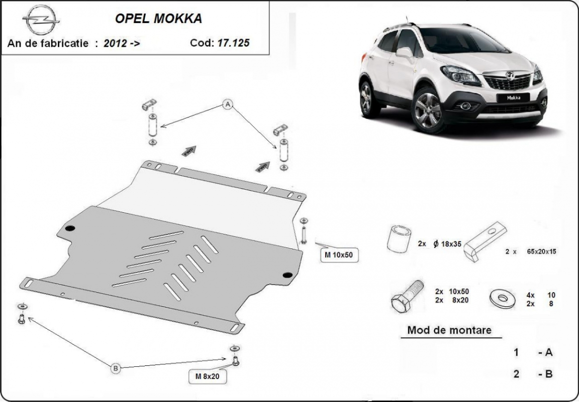Skid plate for the protection of the: engine, gearbox . The skid plate is new and fits perfectly for all versions of Opel Mokka manufactured between 2012 and 2019. Made out of 2 mm thick Steel plate. Screws, nuts, clips, all fastening accessories are included. All skid plates are powder coated to prevent corrosion. The exterior of the skid plate is provided with Steel reinforcements, which increases the resistance to impact. |