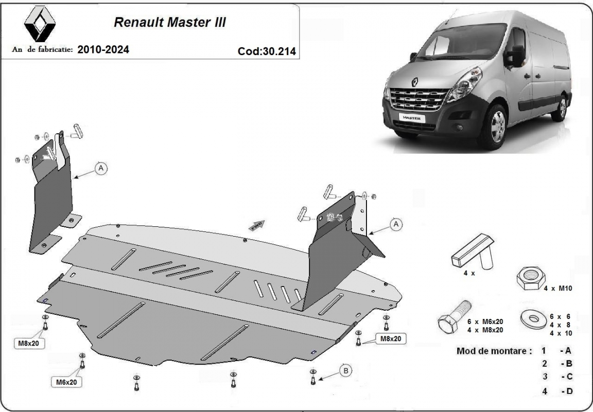 Skid plate for the protection of the: engine, gearbox, radiator, front bumper . The skid plate is new and fits perfectly for all versions of Renault Master 3 manufactured between 2010 and 2024. Made out of 2 mm thick Steel plate. Screws, nuts, clips, all fastening accessories are included. All skid plates are powder coated to prevent corrosion. The exterior of the skid plate is provided with Steel reinforcements, which increases the resistance to impact. |