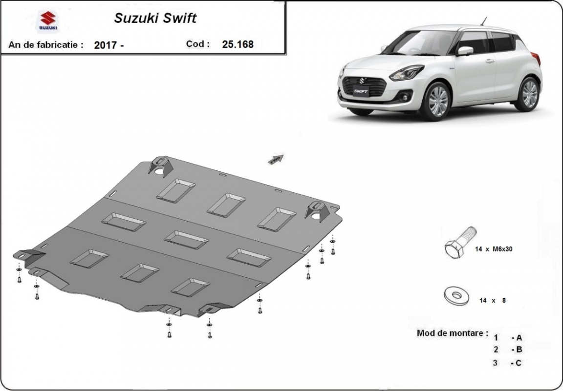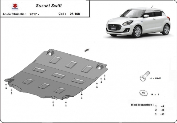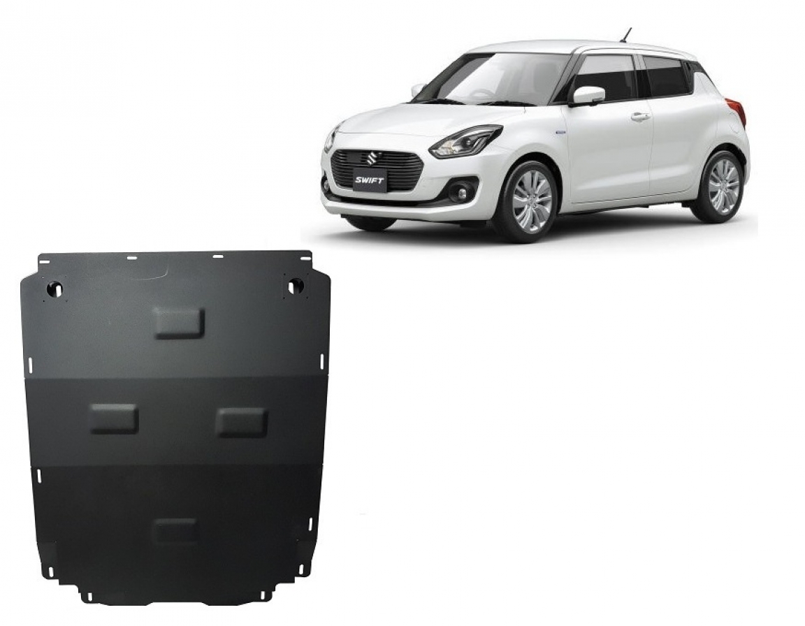 Skid plate for the protection of the: engine, gearbox . The skid plate is new and fits perfectly for all versions of Suzuki Swift manufactured between 2017 and 2026. Made out of 2 mm thick Steel plate. Screws, nuts, clips, all fastening accessories are included. All skid plates are powder coated to prevent corrosion. The exterior of the skid plate is provided with Steel reinforcements, which increases the resistance to impact. |