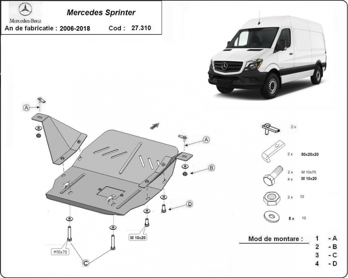 Skid plate for the protection of the: engine, gearbox . The skid plate is new and fits perfectly for all versions of Mercedes Sprinter manufactured between 2006 and 2018. It has an opening for the oil sump, so it's removal won't be necessary to change the oil. Made out of 3 mm thick Steel plate. Screws, nuts, clips, all fastening accessories are included. All skid plates are powder coated to prevent corrosion. The exterior of the skid plate is provided with Steel reinforcements, which increases the resistance to impact. |