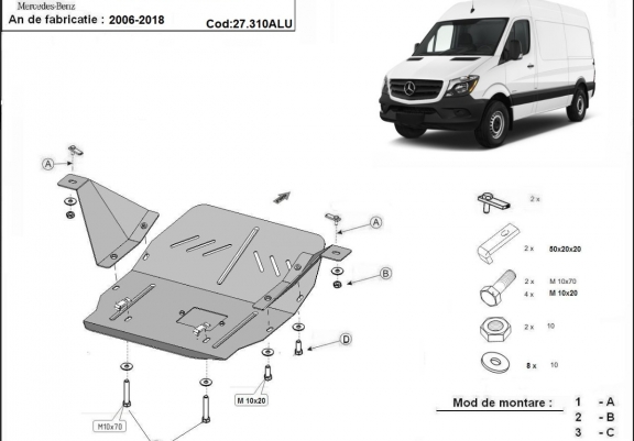 Skid plate for the protection of the: engine, gearbox . The skid plate is new and fits perfectly for all versions of Mercedes Sprinter manufactured between 2006 and 2018. Made out of 3 mm thick Aluminium plate. The shields are made of aluminum, but the mounting brackets are made of steel. Screws, nuts, clips, all fastening accessories are included. All skid plates are powder coated to prevent corrosion. The exterior of the skid plate is provided with Aluminium reinforcements, which increases the resistance to impact. |
