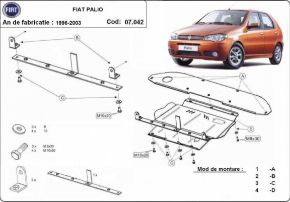 Skid plate for the protection of the: engine, gearbox . The skid plate is new and fits perfectly for all versions of Fiat Palio manufactured between 1996 and 2003. It has an opening for the oil sump, so it's removal won't be necessary to change the oil. Made out of 2 mm thick Steel plate. Screws, nuts, clips, all fastening accessories are included. All skid plates are powder coated to prevent corrosion. The exterior of the skid plate is provided with Steel reinforcements, which increases the resistance to impact. |