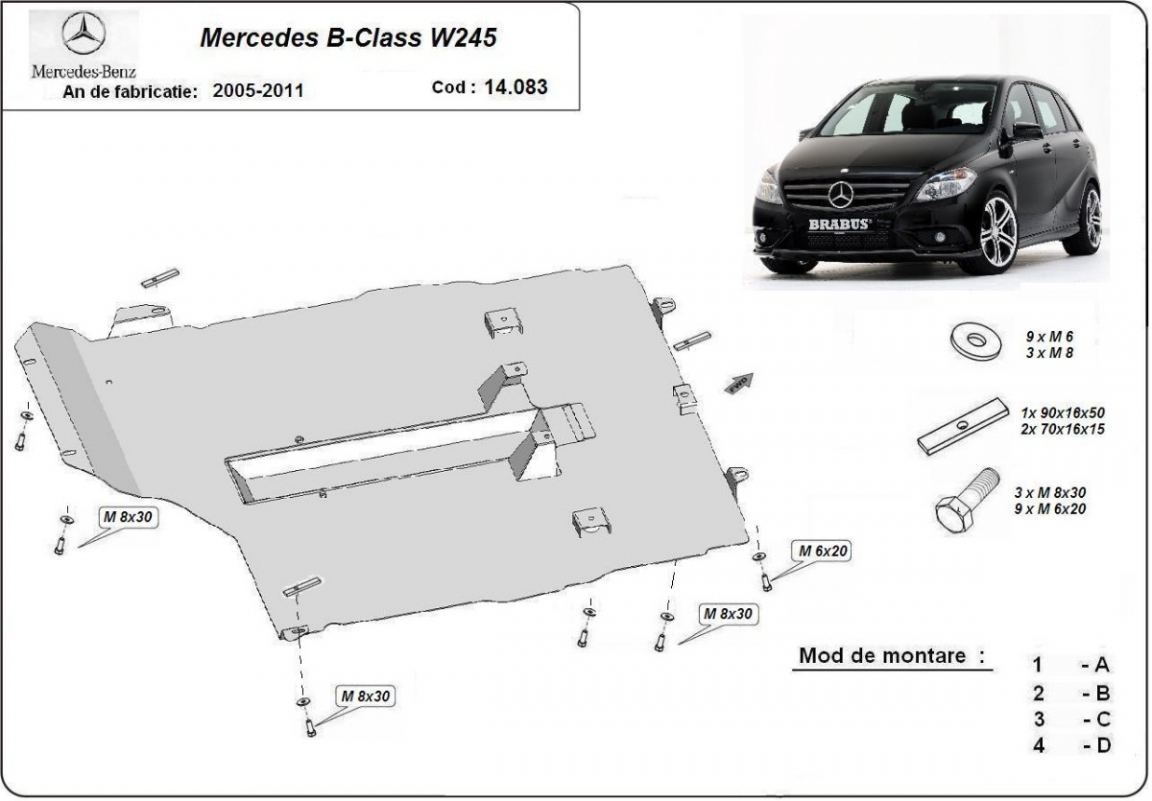 Skid plate for the protection of the: engine, gearbox . The skid plate is new and fits perfectly for all versions of Mercedes B-Class manufactured between 2005 and 2011. Made out of 2 mm thick Steel plate. Screws, nuts, clips, all fastening accessories are included. All skid plates are powder coated to prevent corrosion. The exterior of the skid plate is provided with Steel reinforcements, which increases the resistance to impact. |