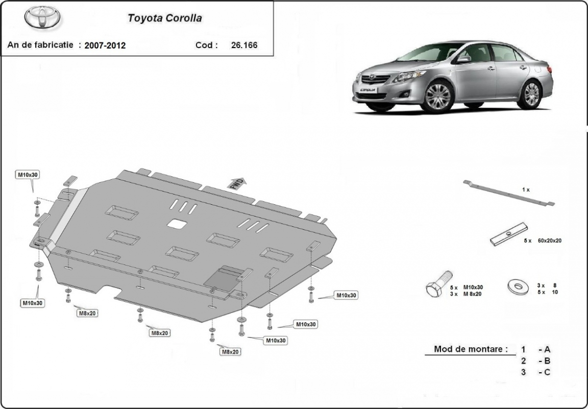 Skid plate for the protection of the: engine . The skid plate is new and fits perfectly for all versions of Toyota Corolla manufactured between 2007 and 2012. It has an opening for the oil sump, so it's removal won't be necessary to change the oil. Made out of 2 mm thick Steel plate. Screws, nuts, clips, all fastening accessories are included. All skid plates are powder coated to prevent corrosion. The exterior of the skid plate is provided with Steel reinforcements, which increases the resistance to impact. |