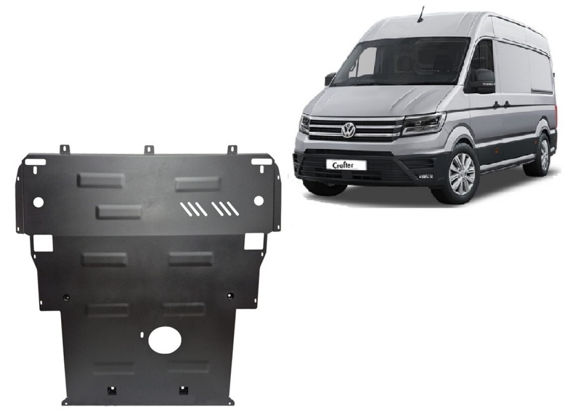 Skid plate for the protection of the: engine, radiator, front bumper, electric power steering gear . The skid plate is new and fits perfectly for the Vw Crafter, with the following engine/drive versions: Toate - manufactured between 2021 and 2026. Made out of 2 mm thick Steel plate. Screws, nuts, clips, all fastening accessories are included. All skid plates are powder coated to prevent corrosion. The exterior of the skid plate is provided with Steel reinforcements, which increases the resistance to impact. |