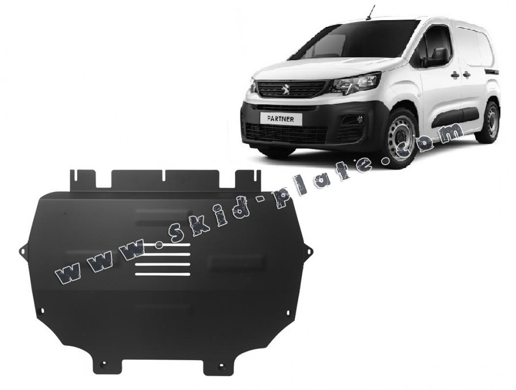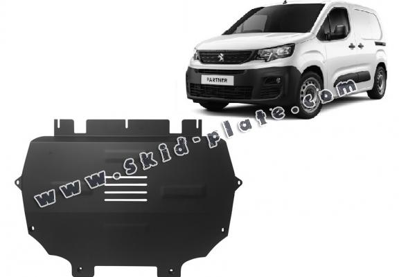 Skid plate for the protection of the: engine, gearbox, radiator . The skid plate is new and fits perfectly for all versions of Peugeot Partner manufactured between 2018 and 2025. Made out of 2 mm thick Steel plate. Screws, nuts, clips, all fastening accessories are included. All skid plates are powder coated to prevent corrosion. The exterior of the skid plate is provided with Steel reinforcements, which increases the resistance to impact. |