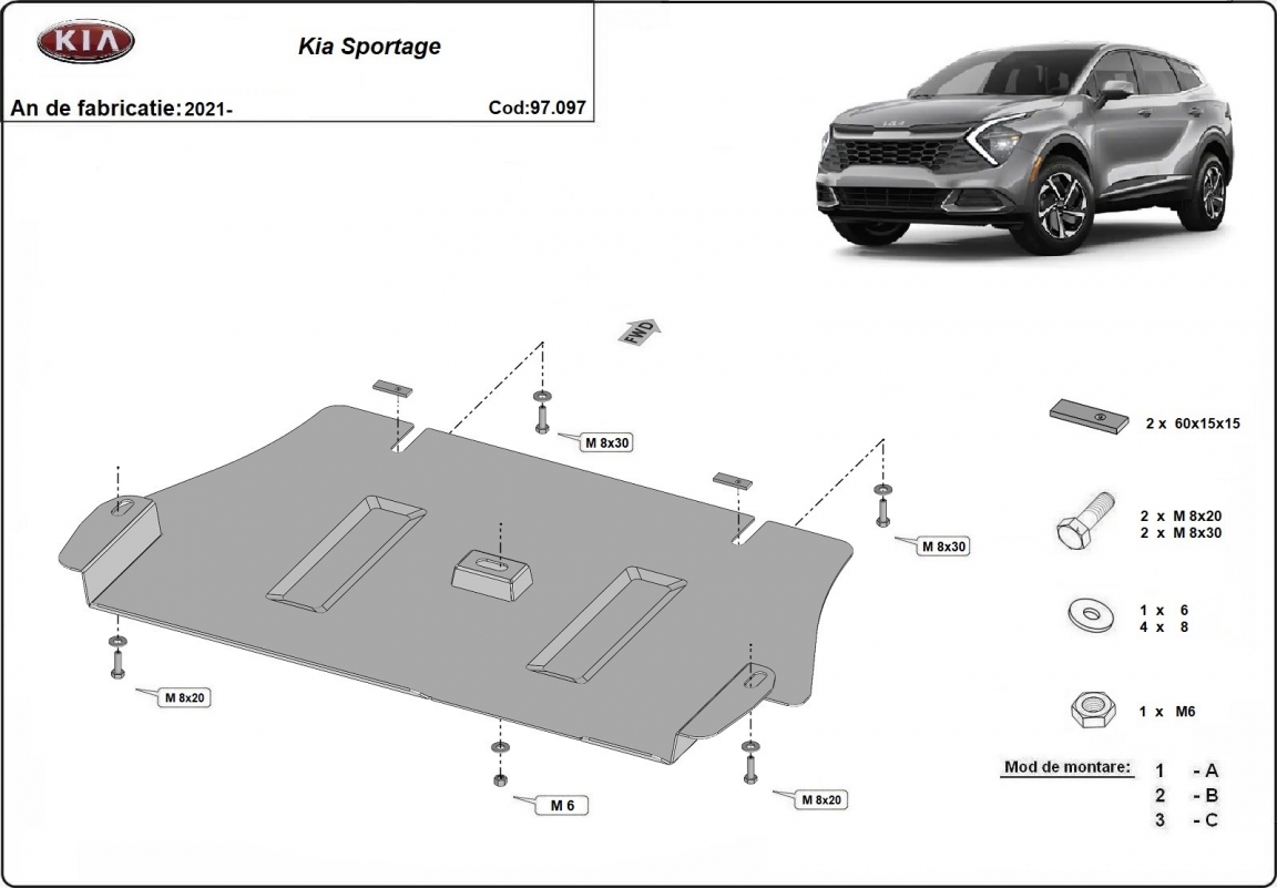 Skid plate for the protection of the: Catalytic converter . The skid plate is new and fits perfectly for all versions of Kia sportage manufactured between 2021 and 2026. Made out of 2 mm thick Steel plate. Screws, nuts, clips, all fastening accessories are included. All skid plates are powder coated to prevent corrosion. The exterior of the skid plate is provided with Steel reinforcements, which increases the resistance to impact. |