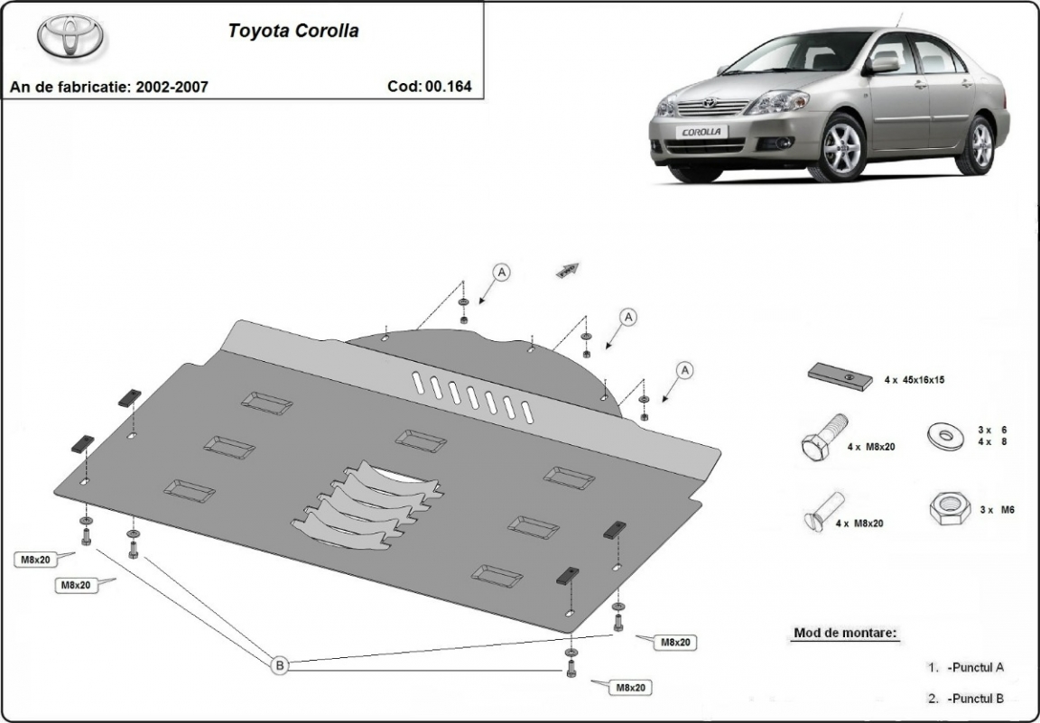Skid plate for the protection of the: Catalytic converter . The skid plate is new and fits perfectly for all versions of Toyota Corolla manufactured between 2002 and 2007. Made out of 2 mm thick Steel plate. Screws, nuts, clips, all fastening accessories are included. All skid plates are powder coated to prevent corrosion. The exterior of the skid plate is provided with Steel reinforcements, which increases the resistance to impact. |