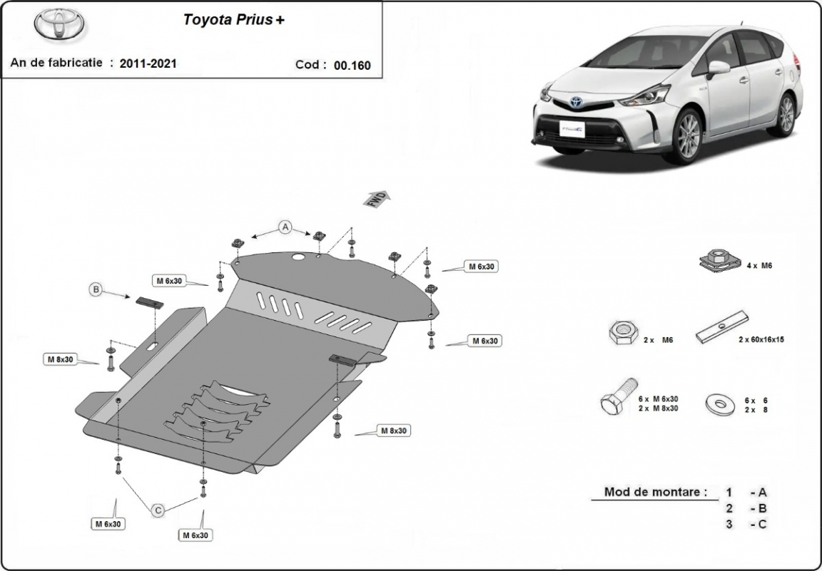 Skid plate for the protection of the: Catalytic converter . The skid plate is new and fits perfectly for all versions of Toyota Prius 3+ manufactured between 2011 and 2021. Made out of 2 mm thick Steel plate. Screws, nuts, clips, all fastening accessories are included. All skid plates are powder coated to prevent corrosion. The exterior of the skid plate is provided with Steel reinforcements, which increases the resistance to impact. |