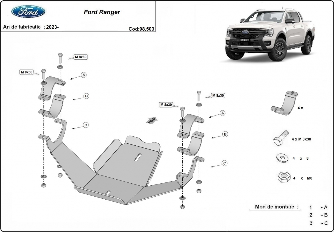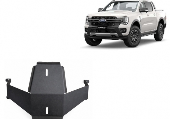 Skid plate for the protection of the: rear differential . The skid plate is new and fits perfectly for all versions of Ford Ranger manufactured between 2023 and 2026. Made out of 4 mm thick Steel plate. Screws, nuts, clips, all fastening accessories are included. All skid plates are powder coated to prevent corrosion. The exterior of the skid plate is provided with Steel reinforcements, which increases the resistance to impact. |