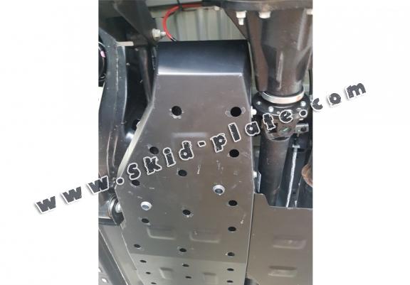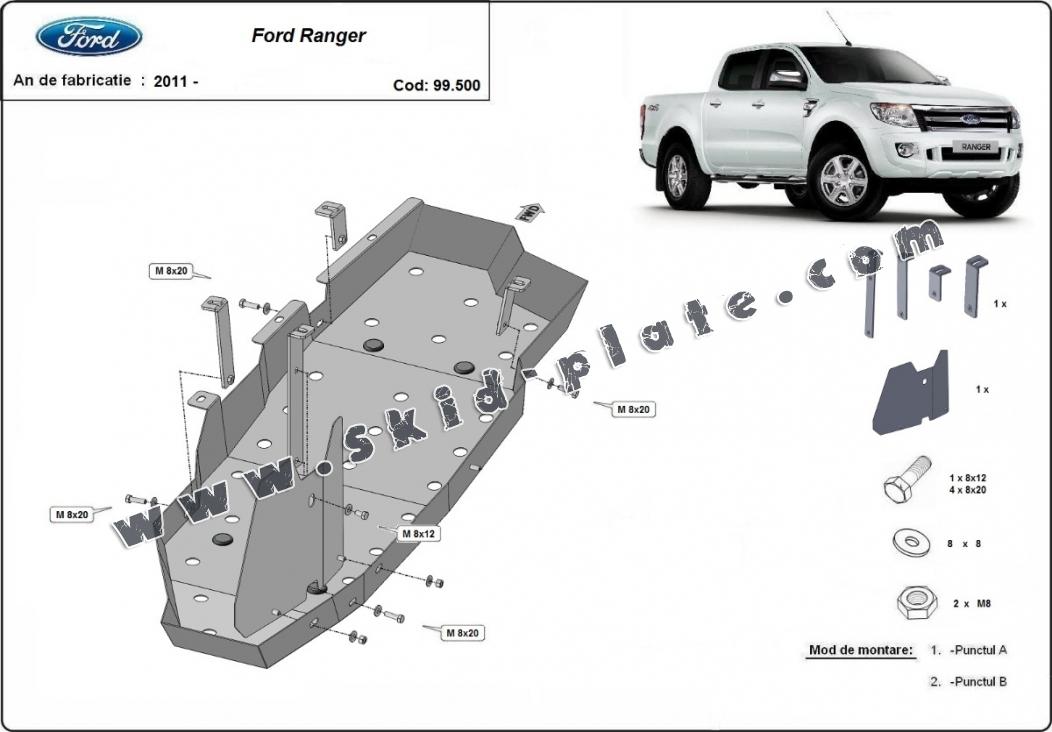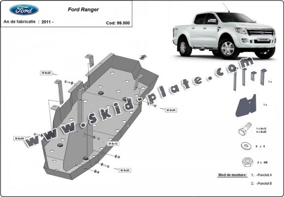 Skid plate for the protection of the: fuel tank . The skid plate is new and fits perfectly for all versions of Ford Ranger manufactured between 2011 and 2023. Made out of 2 mm thick Steel plate. Screws, nuts, clips, all fastening accessories are included. All skid plates are powder coated to prevent corrosion. The exterior of the skid plate is provided with Steel reinforcements, which increases the resistance to impact. |