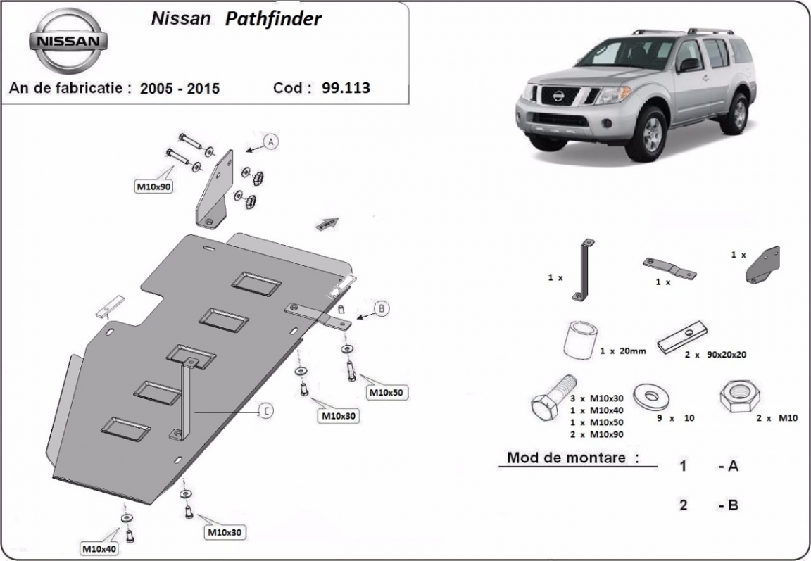 Skid plate for the protection of the: fuel tank . The skid plate is new and fits perfectly for all versions of Nissan Pathfinder R51 manufactured between 2005 and 2015. Made out of 2.5 mm thick Steel plate. Screws, nuts, clips, all fastening accessories are included. All skid plates are powder coated to prevent corrosion. The exterior of the skid plate is provided with Steel reinforcements, which increases the resistance to impact. |
