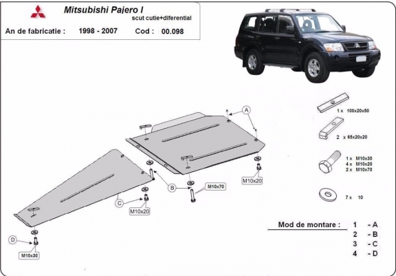 Skid plate for the protection of the: gearbox, differential . The skid plate is new and fits perfectly for the Mitsubishi Pajero Sport 1, with the following engine/drive versions: - manufactured between 1998 and 2007. Made out of 3 mm thick Steel plate. Screws, nuts, clips, all fastening accessories are included. All skid plates are powder coated to prevent corrosion. The exterior of the skid plate is provided with Steel reinforcements, which increases the resistance to impact. |