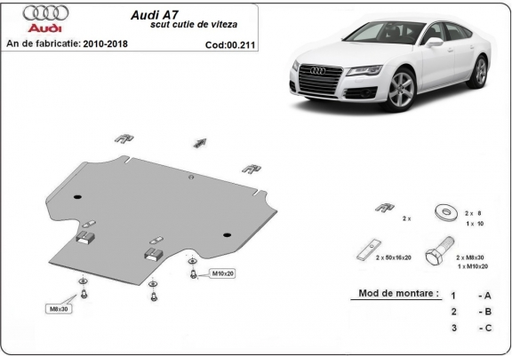 Skid plate for the protection of the: gearbox . The skid plate is new and fits perfectly for all versions of Audi A7 manufactured between 2011 and 2018. Made out of 2 mm thick Steel plate. Screws, nuts, clips, all fastening accessories are included. All skid plates are powder coated to prevent corrosion. The exterior of the skid plate is provided with Steel reinforcements, which increases the resistance to impact. |