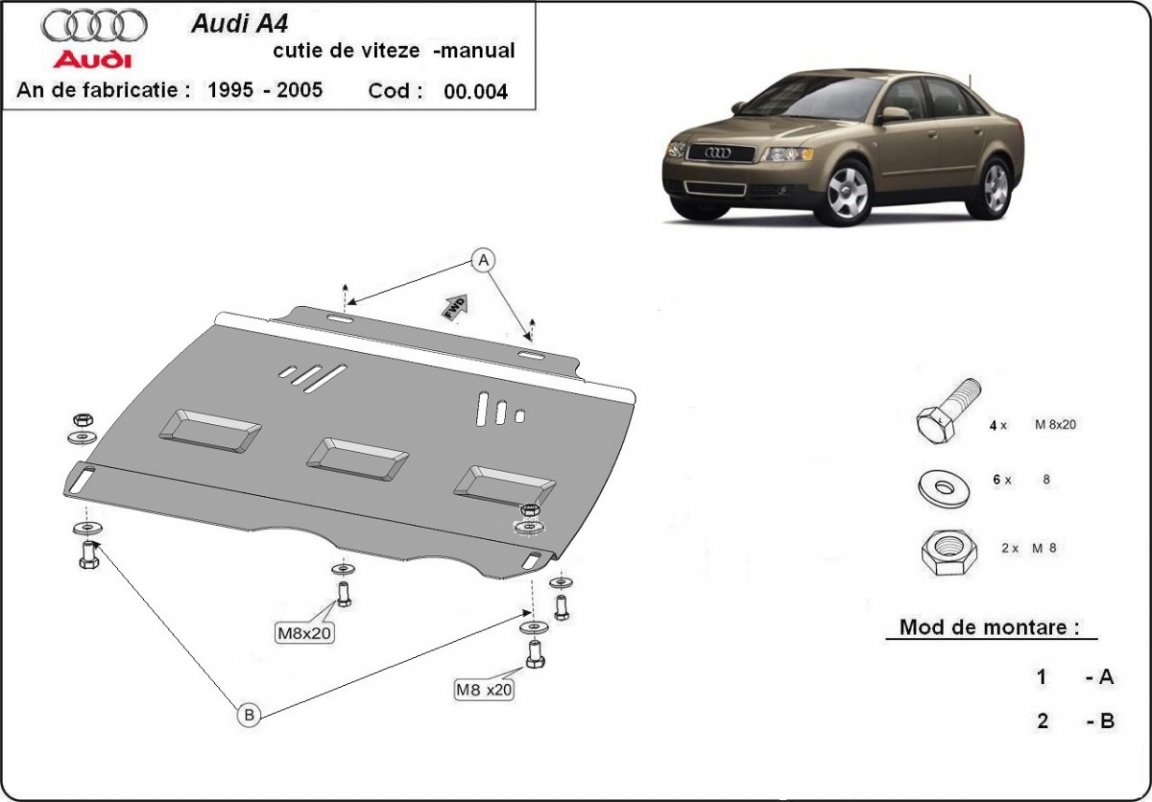 Skid plate for the protection of the: gearbox . The skid plate is new and fits perfectly for all versions of Audi A4 B6 - manuelle manufactured between 2000 and 2005. Made out of 2 mm thick Steel plate. Screws, nuts, clips, all fastening accessories are included. All skid plates are powder coated to prevent corrosion. The exterior of the skid plate is provided with Steel reinforcements, which increases the resistance to impact. |