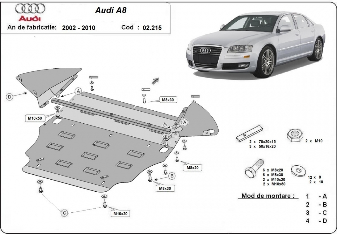 Skid plate for the protection of the: engine, gearbox, radiator, front bumper . The skid plate is new and fits perfectly for all versions of Audi A8 manufactured between 2002 and 2010. Made out of 2 mm thick Steel plate. Screws, nuts, clips, all fastening accessories are included. All skid plates are powder coated to prevent corrosion. The exterior of the skid plate is provided with Steel reinforcements, which increases the resistance to impact. |