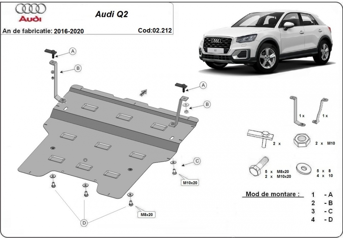 Skid plate for the protection of the: engine, gearbox, radiator . The skid plate is new and fits perfectly for all versions of Audi Q2 manufactured between 2016 and 2020. Made out of 2 mm thick Steel plate. Screws, nuts, clips, all fastening accessories are included. All skid plates are powder coated to prevent corrosion. The exterior of the skid plate is provided with Steel reinforcements, which increases the resistance to impact. |