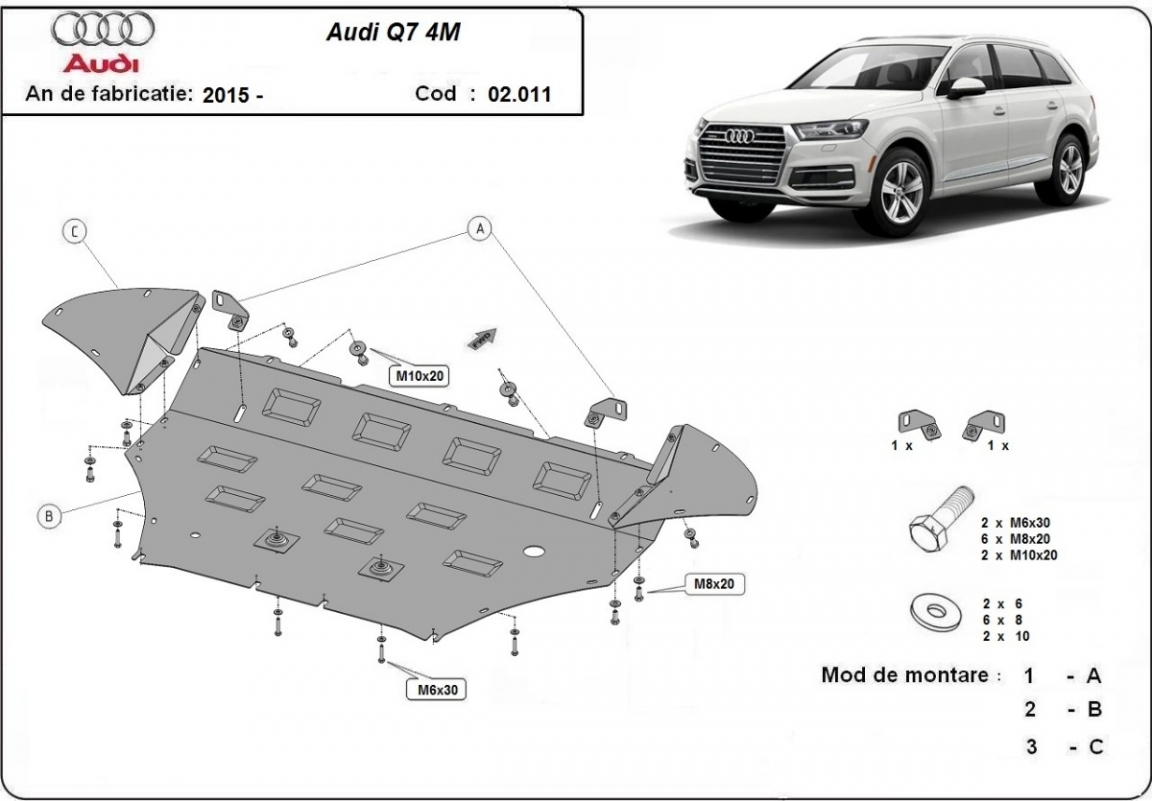 Skid plate for the protection of the: engine, radiator, front bumper . The skid plate is new and fits perfectly for all versions of Audi Q7 manufactured between 2015 and 2026. Made out of 2 mm thick Steel plate. Screws, nuts, clips, all fastening accessories are included. All skid plates are powder coated to prevent corrosion. The exterior of the skid plate is provided with Steel reinforcements, which increases the resistance to impact. |