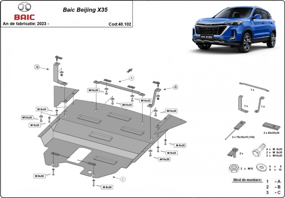 Skid plate for the protection of the: engine, gearbox, radiator, front bumper . The skid plate is new and fits perfectly for all versions of Baic Beijing X35 manufactured between 2023 and 2026. Made out of 2 mm thick Steel plate. Screws, nuts, clips, all fastening accessories are included. All skid plates are powder coated to prevent corrosion. The exterior of the skid plate is provided with Steel reinforcements, which increases the resistance to impact. |