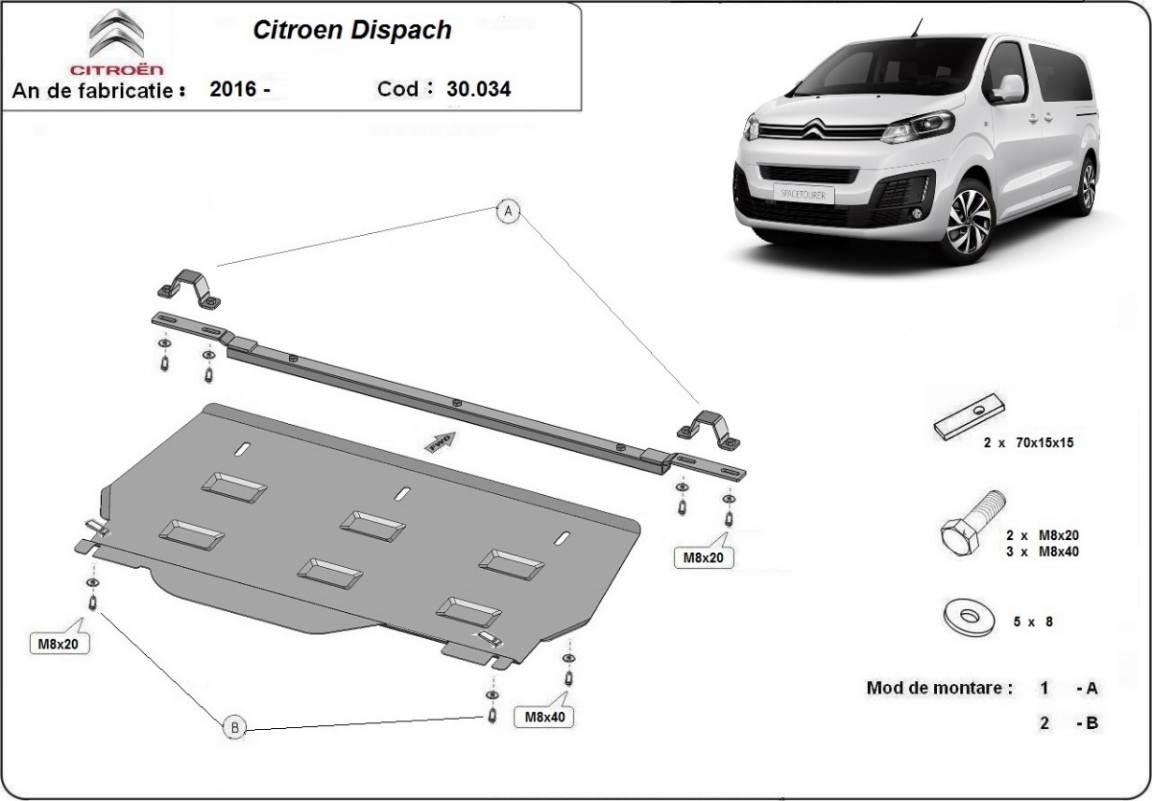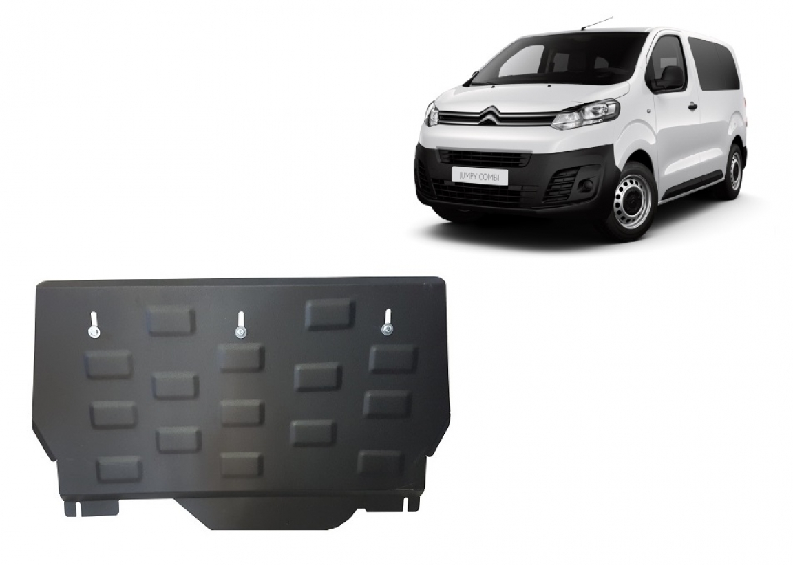Skid plate for the protection of the: engine, gearbox . The skid plate is new and fits perfectly for all versions of Citroen Dispatch MPV manufactured between 2016 and 2026. Made out of 2 mm thick Steel plate. Screws, nuts, clips, all fastening accessories are included. All skid plates are powder coated to prevent corrosion. The exterior of the skid plate is provided with Steel reinforcements, which increases the resistance to impact. |