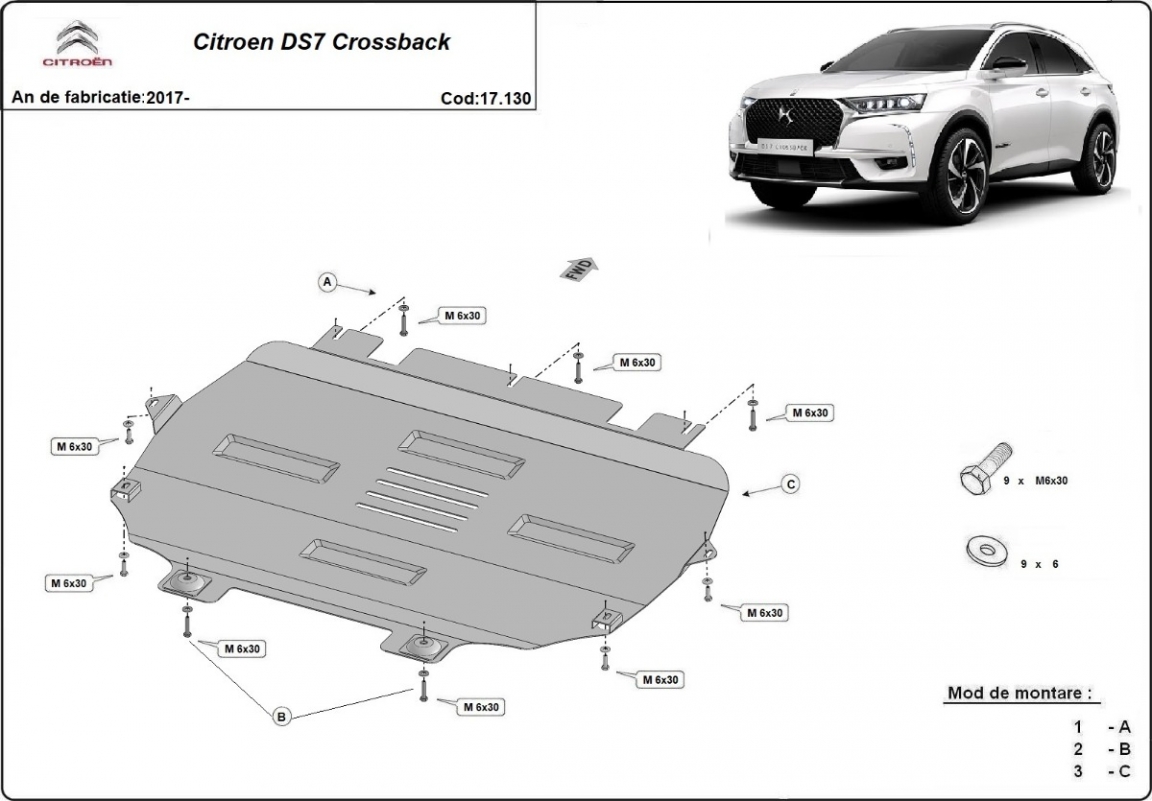 Skid plate for the protection of the: engine, gearbox, radiator . The skid plate is new and fits perfectly for all versions of Citroen DS 7 Crossback manufactured between 2017 and 2026. Made out of 2 mm thick Steel plate. Screws, nuts, clips, all fastening accessories are included. All skid plates are powder coated to prevent corrosion. The exterior of the skid plate is provided with Steel reinforcements, which increases the resistance to impact. |